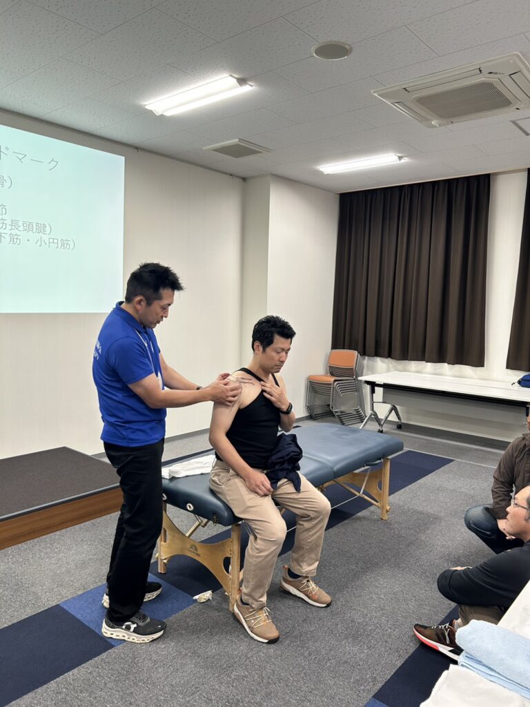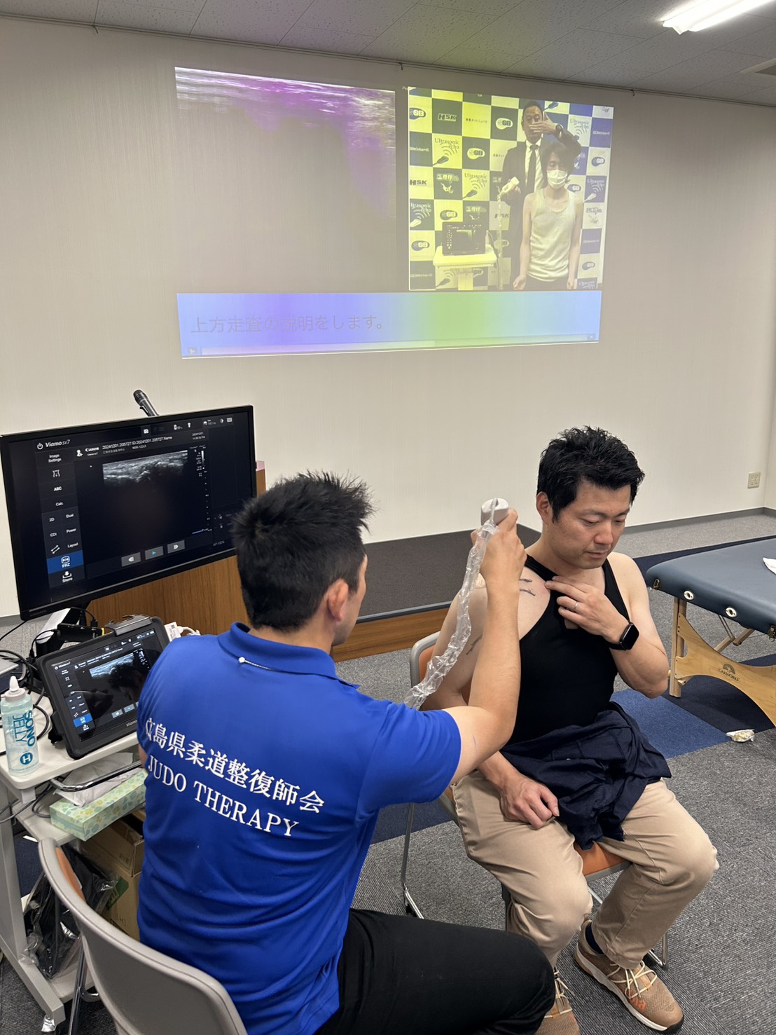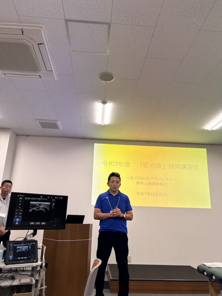 肩関節脱臼整復固定講習会 ブログ 2025.10.272025.10.28 昨日、10/26(日)柔道整復術公認100周年事業 『匠の技伝承プロジェクト』の一環として、 「肩甲上腕関節脱臼」整復・固定実技講習会が 広島県柔道整復師会館で開催されました🎌 自分はエコー実技の担当講師を務めさせていただきました。 参加いただいた先生方も熱心に実技に取り組ん でおられました🔥 地域医療の一端としてこれからも技術研鑽にん でいきます🔥💪